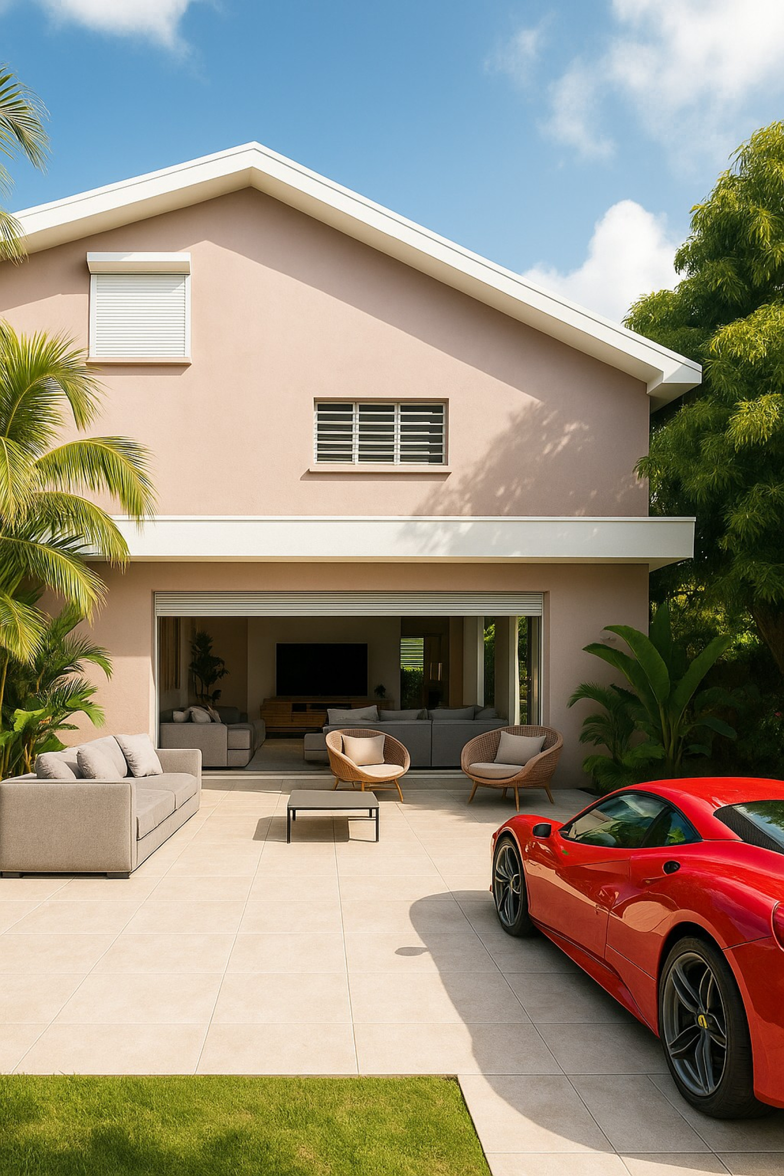 Le cœur de la maison s'ouvre sur un vaste séjour cathédrale, baigné de lumière grâce à ses volumes impressionnants et ses grandes ouvertures. Une mezzanine surplombe l'espace de vie, renforçant la sensation d'espace et de clarté. Le séjour se prolonge naturellement vers une terrasse de plain-pied, seulement séparée du jardin arboré, offrant ainsi un cadre de vie fluide et harmonieux, parfaitement propice à l'aménagement d'une piscine.